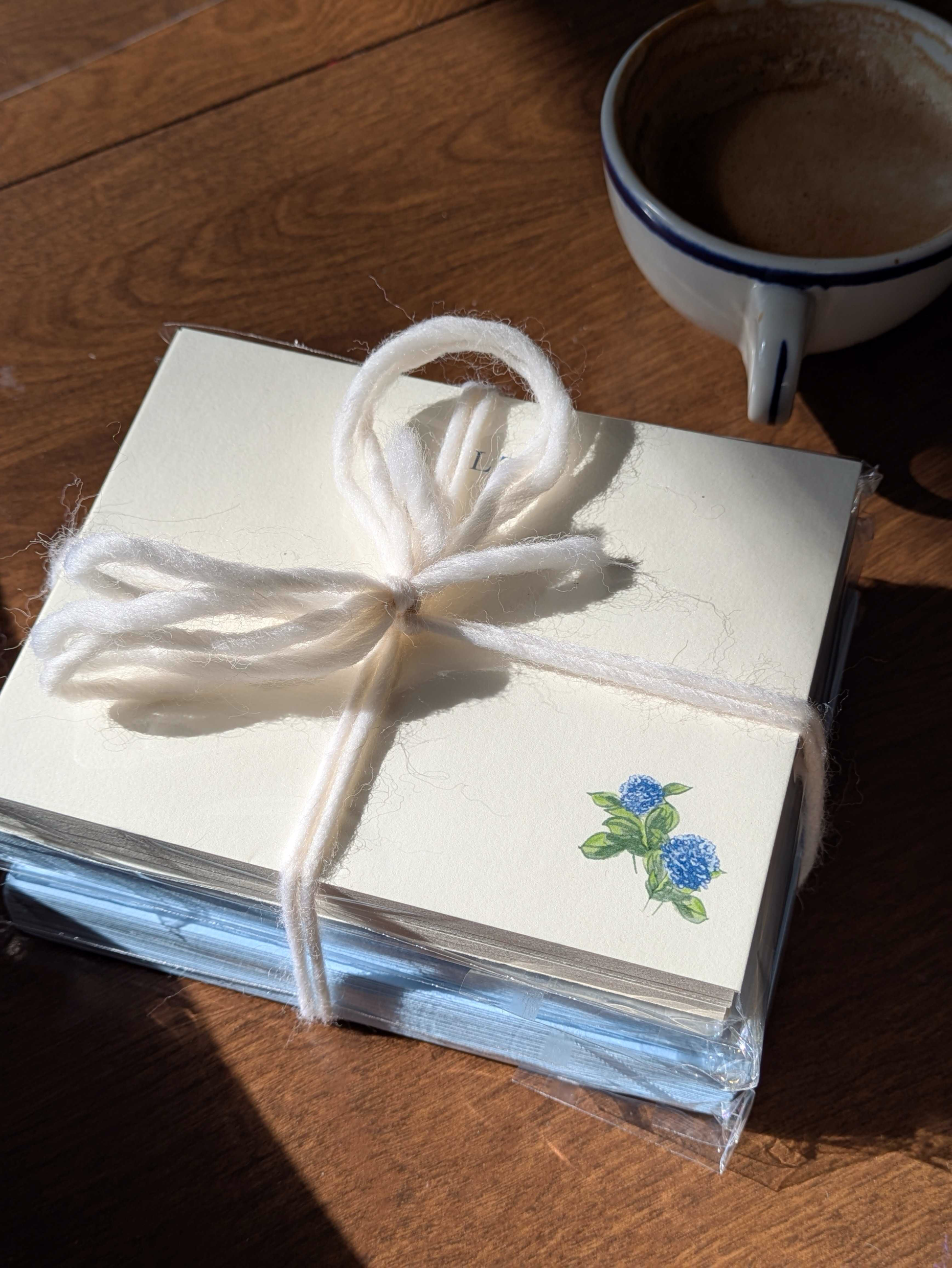 Hand illustrated set of flat notecards with quality matching colored envelopes. Printed by a local New England printer with a strong business in quality paper products for weddings and formal affairs. A2 sizing.